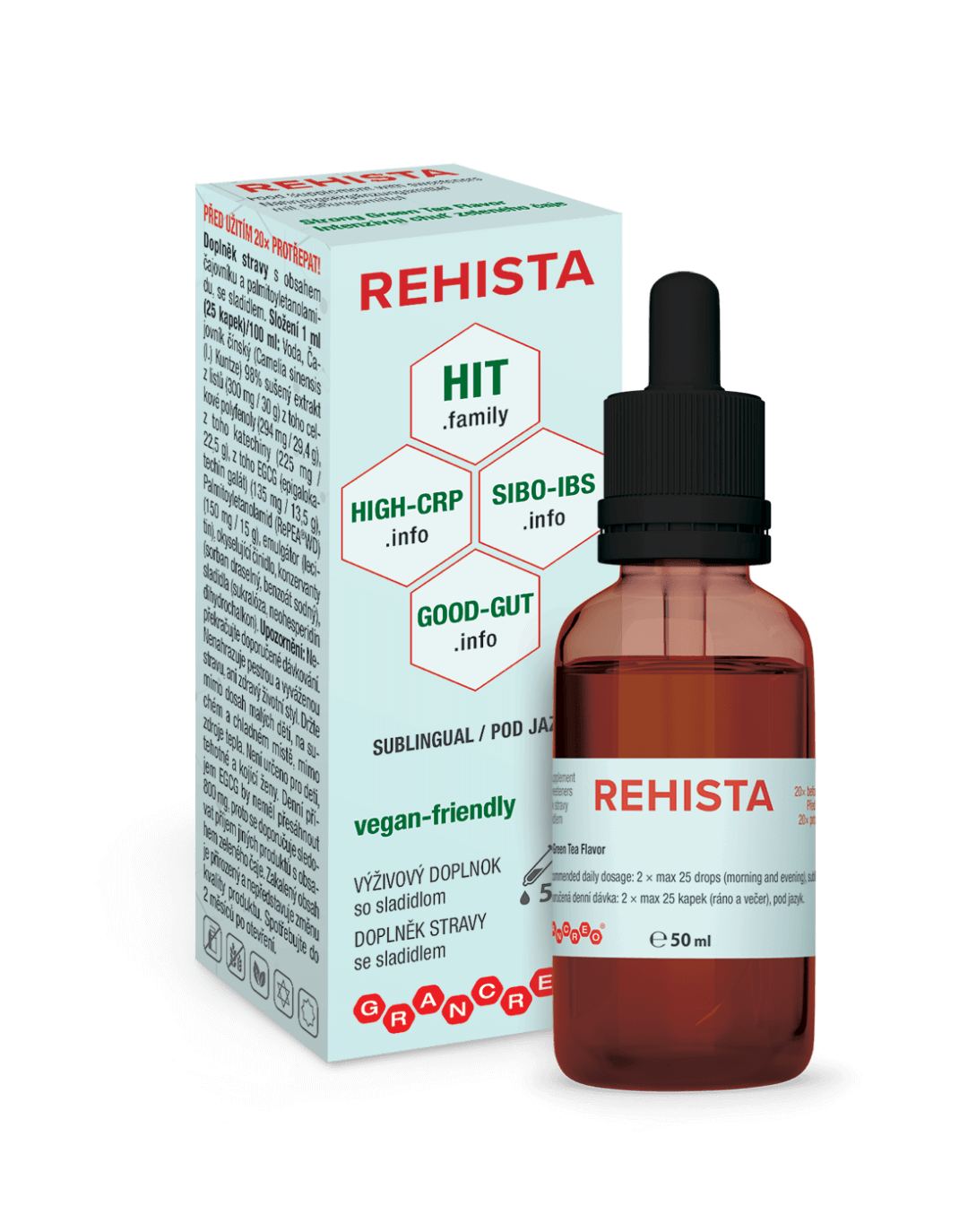 Kapi REHISTA pogodne su za osobe s histaminskom intolerancijom (HIT), alergijom na bjelančevine kravljeg mlijeka (CMA), pretjeranim rastom bakterija u tankom crijevu (SIBO) ili dugotrajnim ili ponavljajućim probavnim problemima. Sadrže provjerene biljne ekstrakte (palmitoiletanolamid i EGCG iz zelenog čaja) i ne sadrže probiotike.